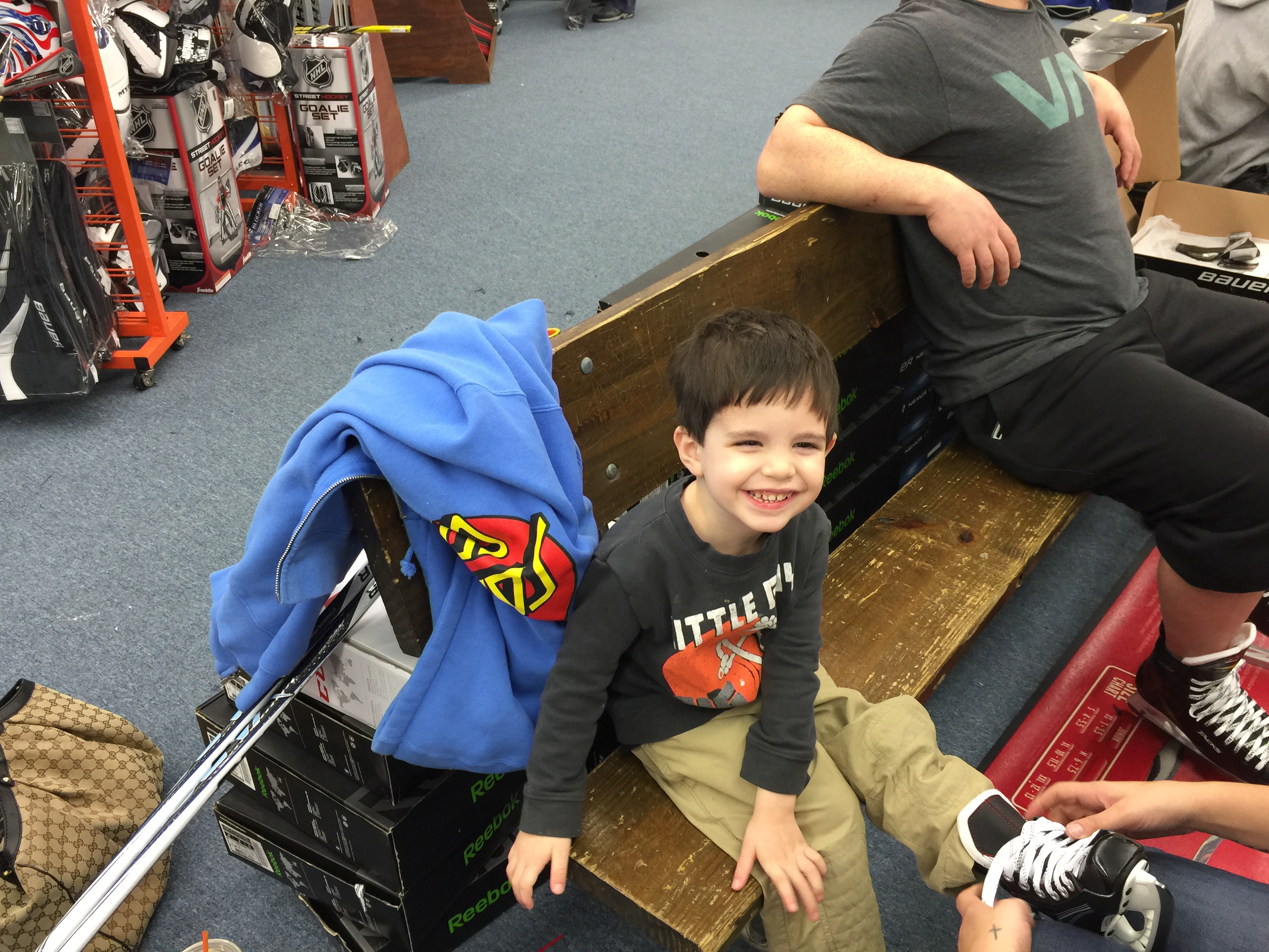 Today marks a truly special day for Atticus and our family. It was our first trip to, as Atty calls it, “the hockey store”. After a lazy Sunday morning, from which we awoke with quite a chill, we unwrapped ourselves from a series of quilts, sweaters and woolen socks, to try on the day and some skates at the Pure Hockey store in Medford Square.